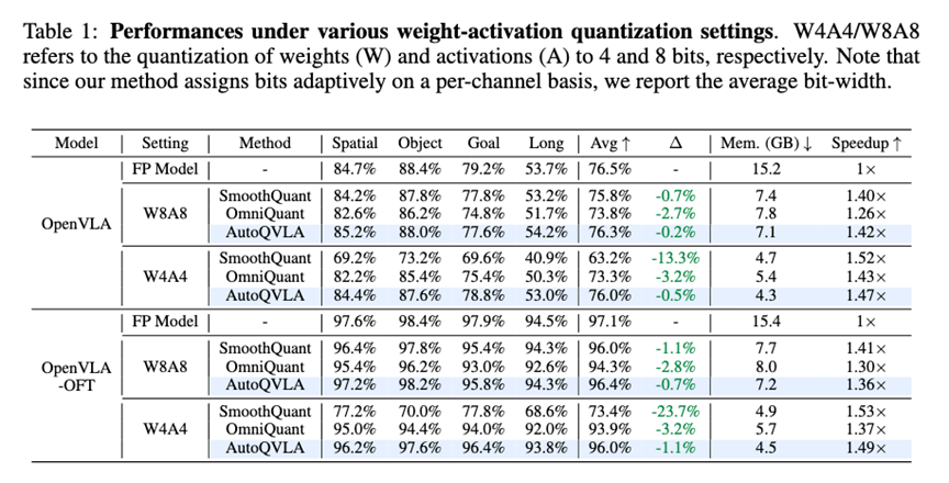 - 极致压缩: 在 OpenVLA-OFT 模型上,QVLA 仅需 29.2% 的显存(约 4.5GB),推理速度提升 1.49倍 。