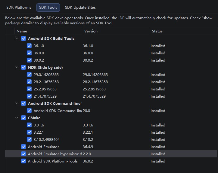 工程中自动Sync(注意,这期间会遇到很多兼容性问题,包括但不限于,使用合适版本的NDK和CPP和CMake,笔者使用的是下面这个版本,可以在工程的build.gradle中写死)