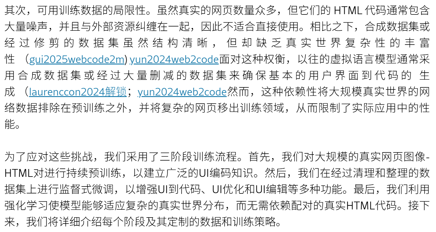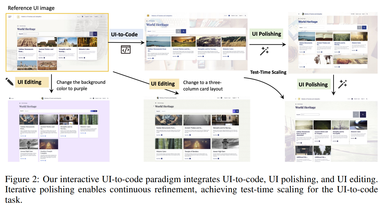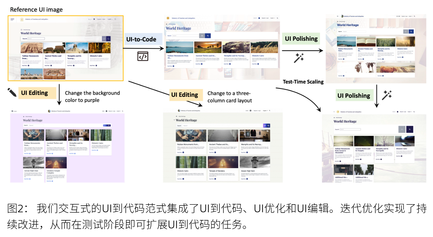 →验证:交互式范式+多阶段训练 → 增强UI-to-Code的能力+用户界面优化能力