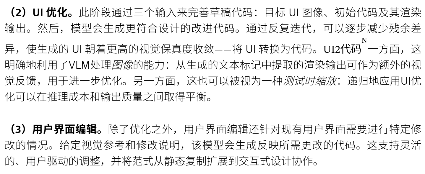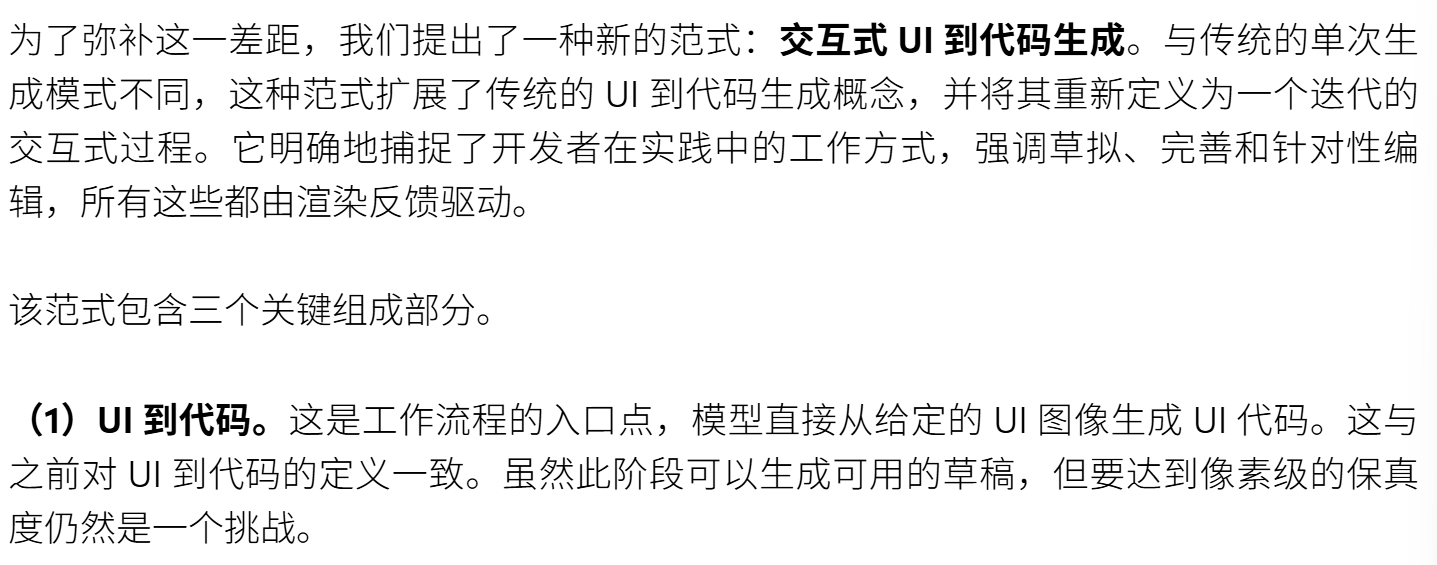范式的组成部分:① UI→代码;②三个输入(ui图像、初始代码、渲染输出) 优化 草稿代码,反复迭代;③界面修改,用户驱动
