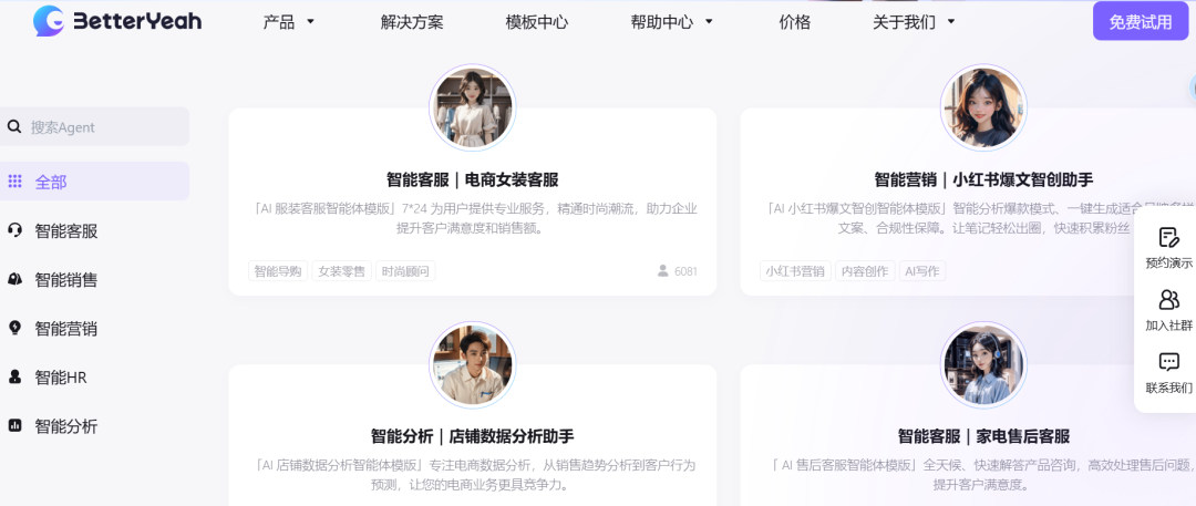 面向企业级市场,聚焦 AI 客服、营销、销售等多个关键领域,提供智能化升级的全面解决方案。其官方智能体中心汇聚了全类别的智能应用,包括智能客服系统、针对电商、销售、营销、HR 等垂直行业的定制化方案以及学习资源等,助力企业轻松实现数字化转型与智能化升级。