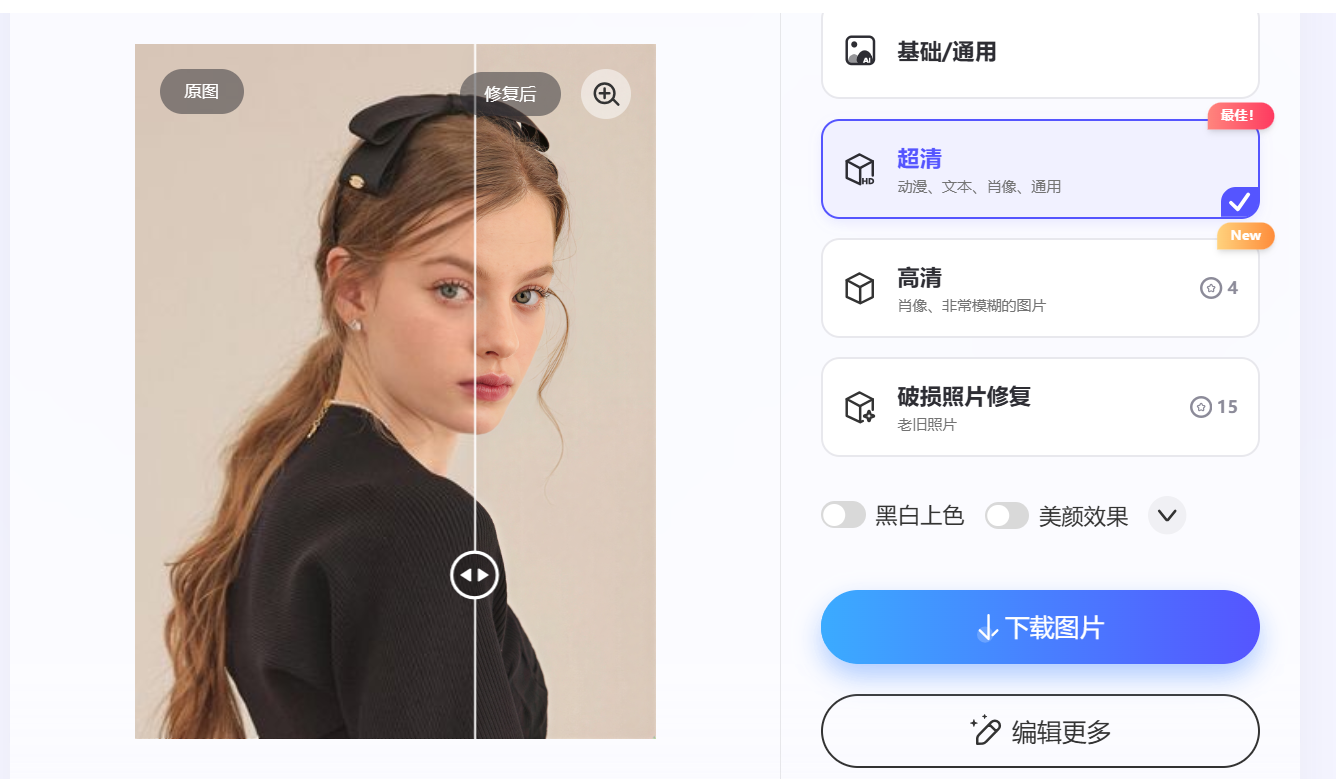 老照片修复: 它的AI补齐功能在提升分辨率的同时,较好地保留了皮肤纹理,避免了过度磨皮导致的“假脸感”。