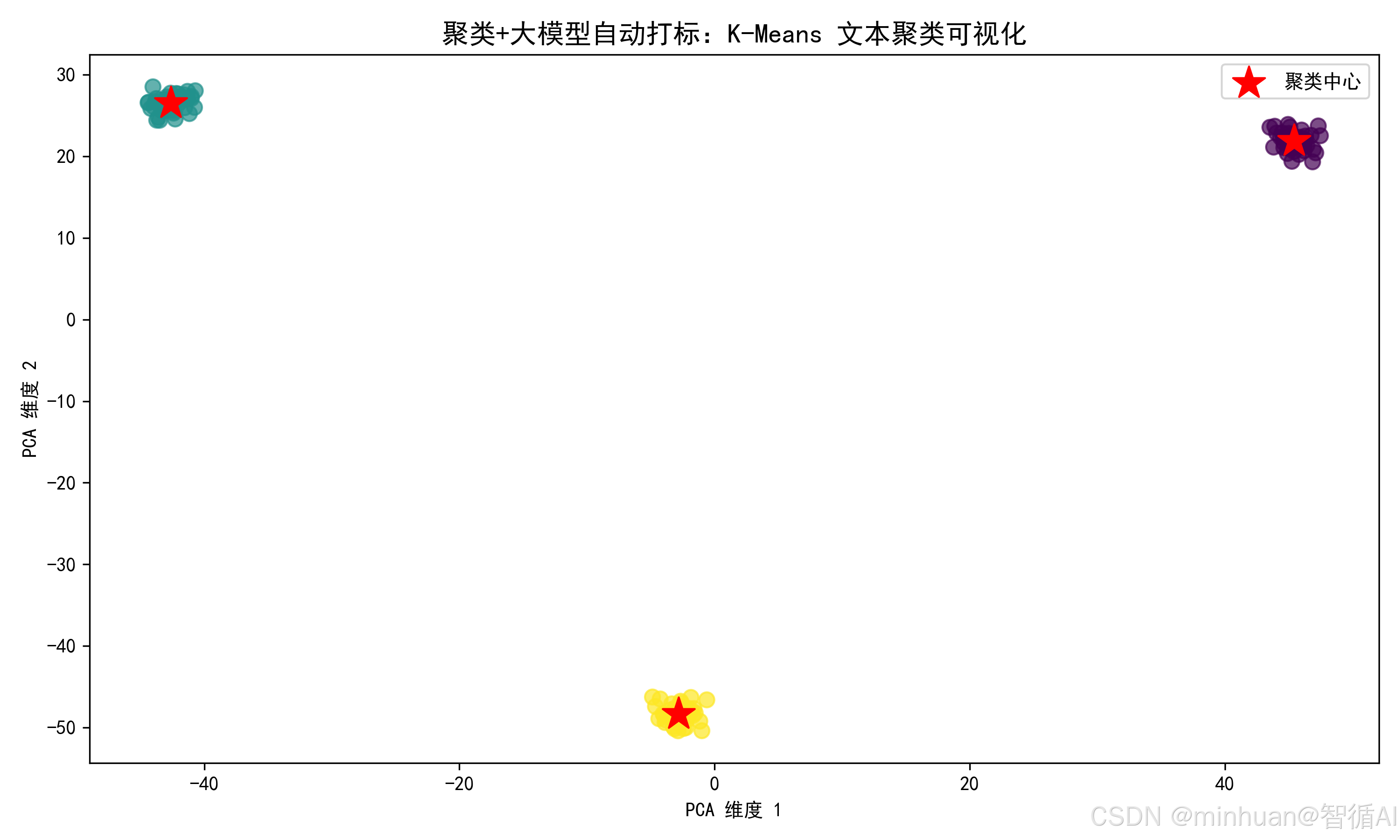 - 可视化:生成词云(直观看到每类的核心词)和 PCA 散点图(直观看到聚类效果);