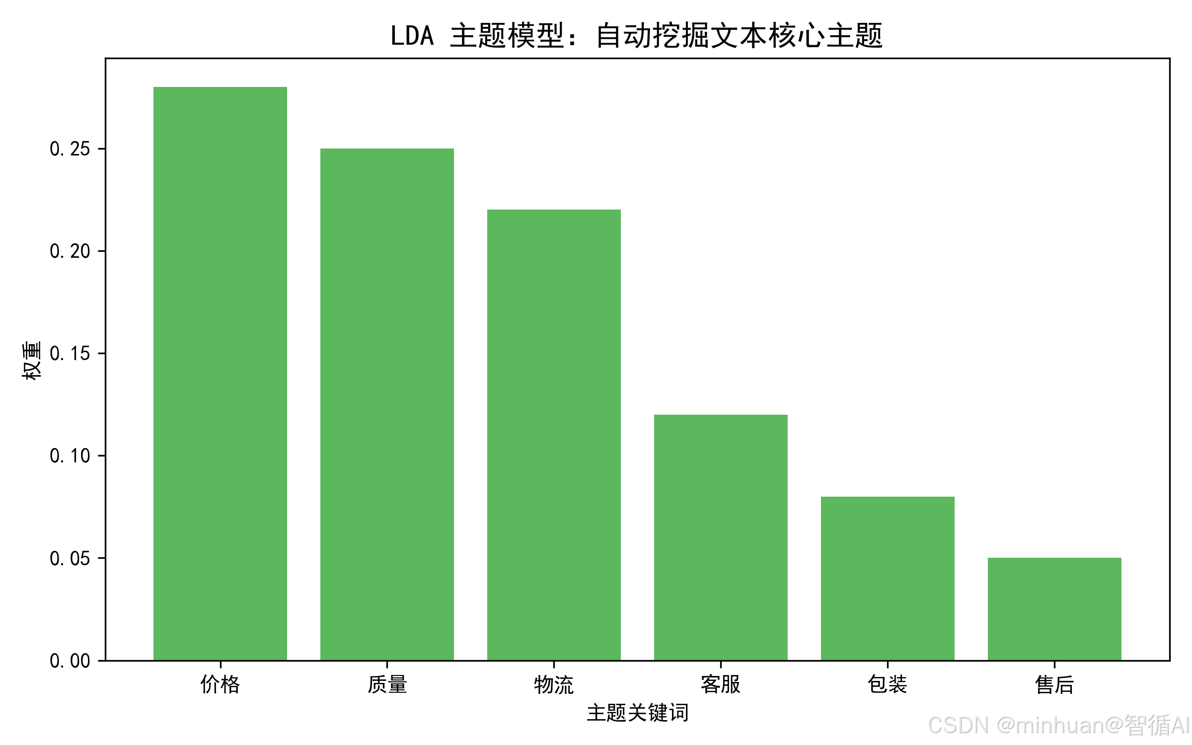 - 输出可解释的主题:不仅分组,还能告诉你每个主题由哪些关键词组成,如主题1=[价格, 贵, 性价比, 便宜];