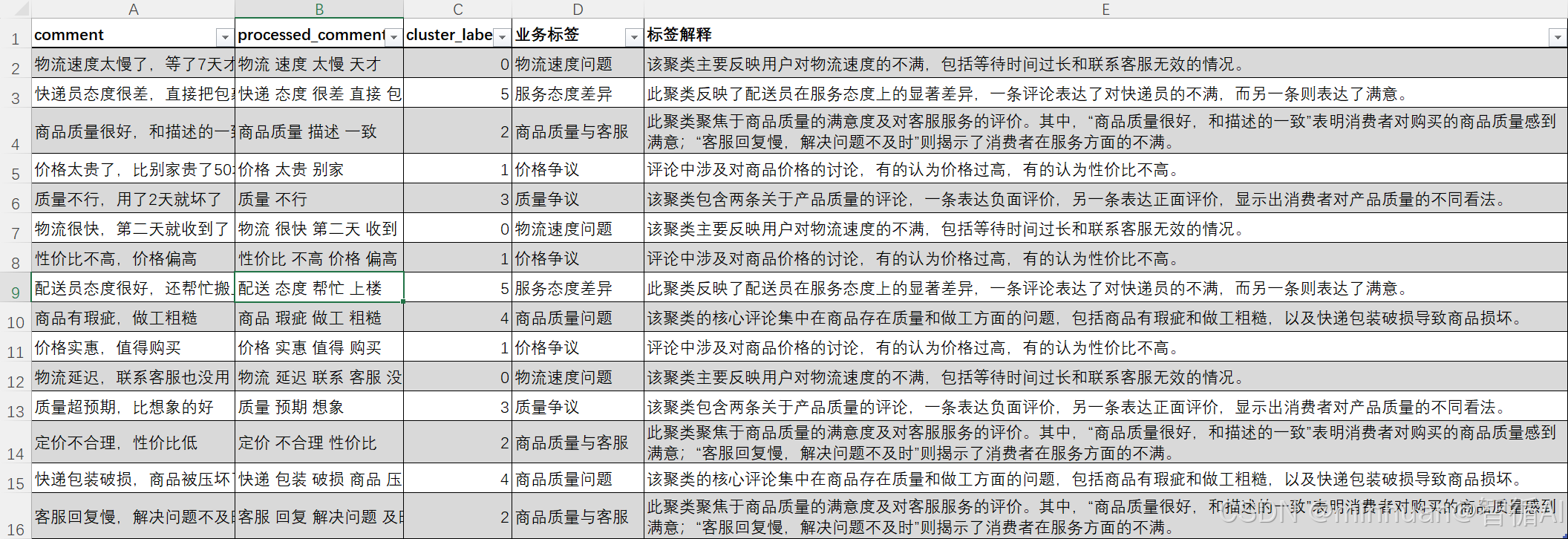 - 输出结果:最终生成 CSV 文件,包含原始评论、聚类标签、业务标签、标签解释,可直接用于业务分析。