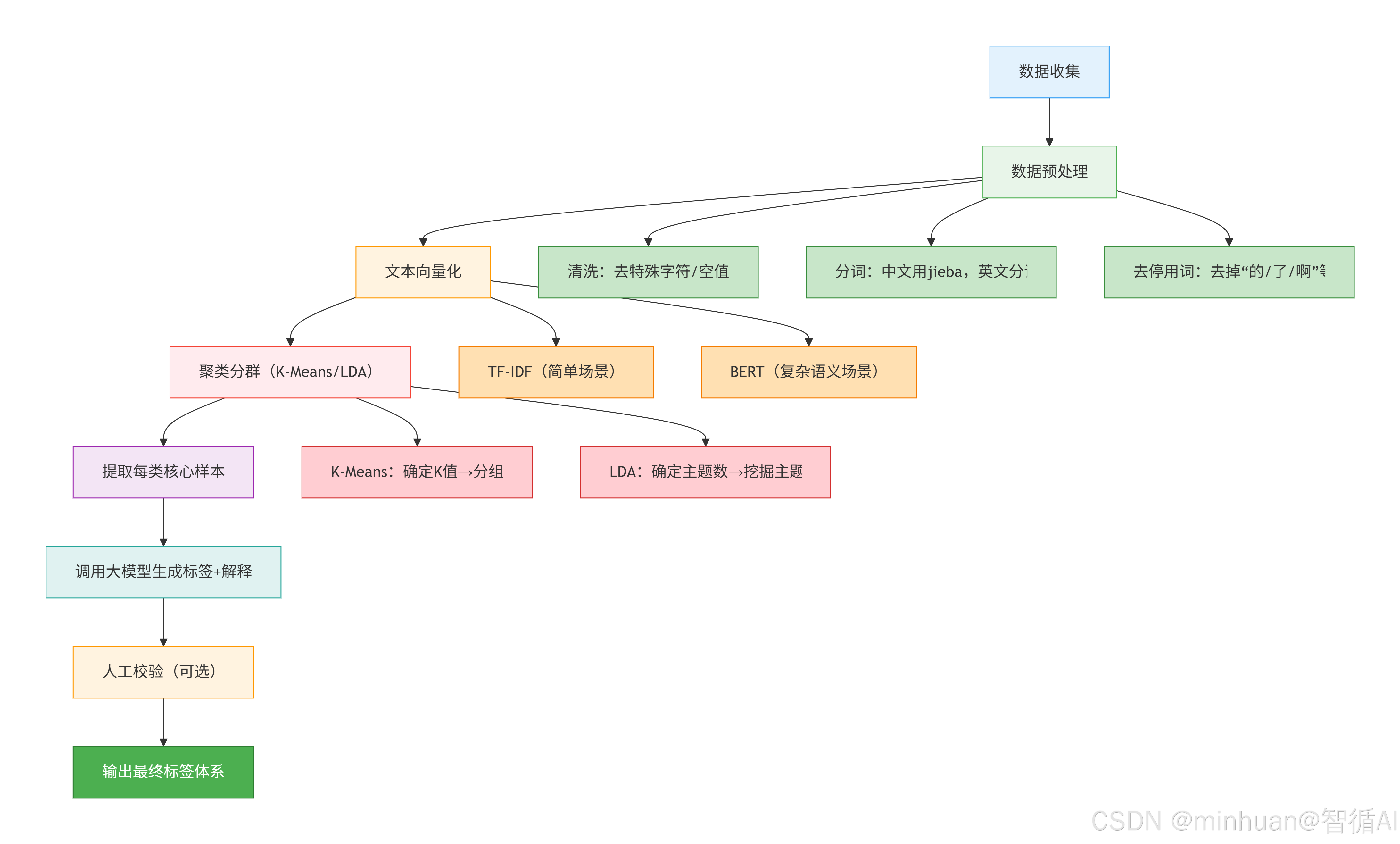- 1. 数据收集:获取原始文本数据,比如电商评论、客服工单;