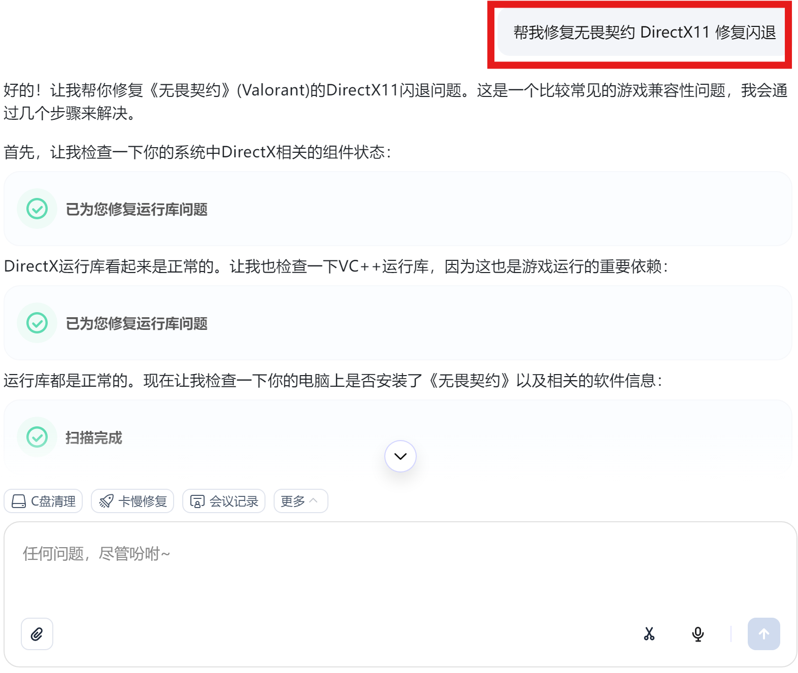 输入指令如:“帮我修复无畏契约 DirectX11” 修复闪退系统自动检测 DirectX11、VC++ 和驱动状态。