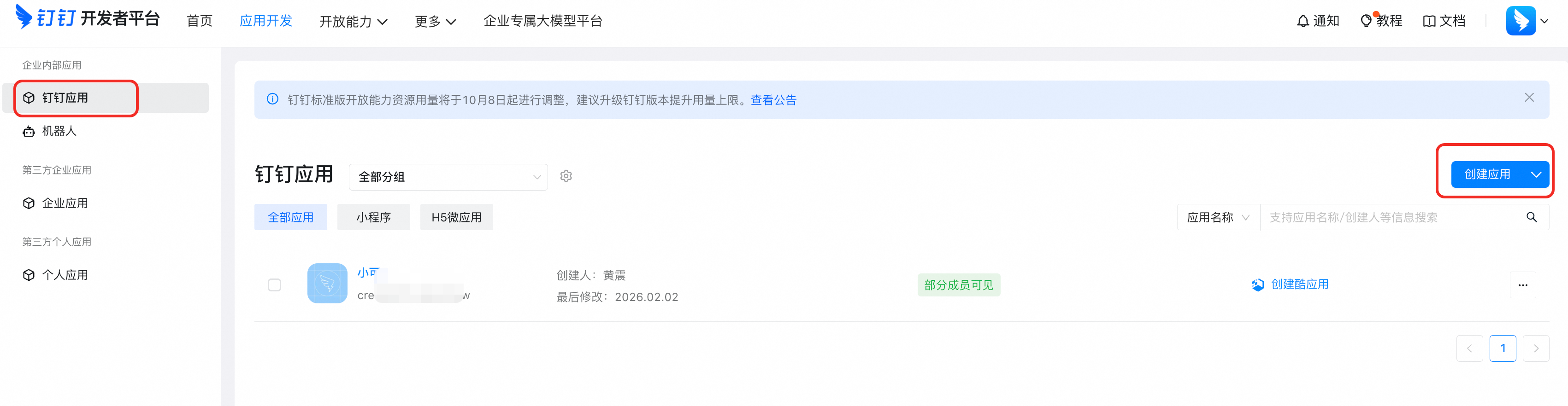 创建钉钉应用需要您的钉钉账号有开发者权限。您可以联系您的组织管理员获取钉钉开放平台的开发权限,具体操作请参见获取开发者权限。