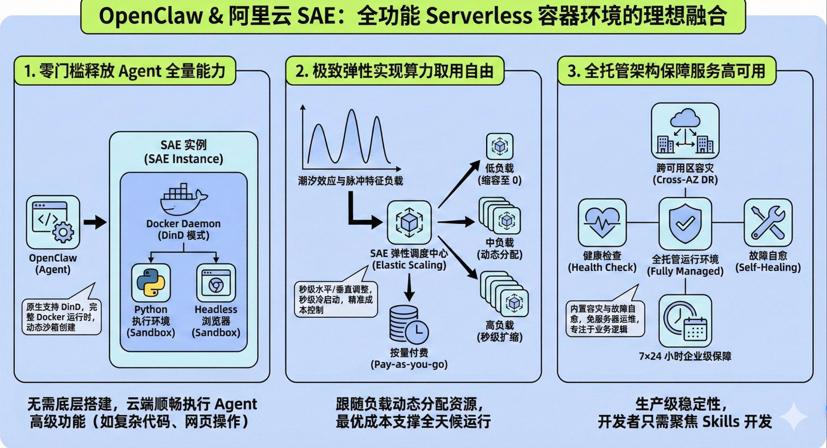 OpenClaw 的执行力依赖于对 Docker 运行时和系统资源的深度调用。阿里云 SAE 凭借全功能的容器环境与Serverless 化的资源调度,为 OpenClaw 提供了一个既能完整运行其所有高级功能,又能避免资源闲置与运维复杂的理想托管平台。
