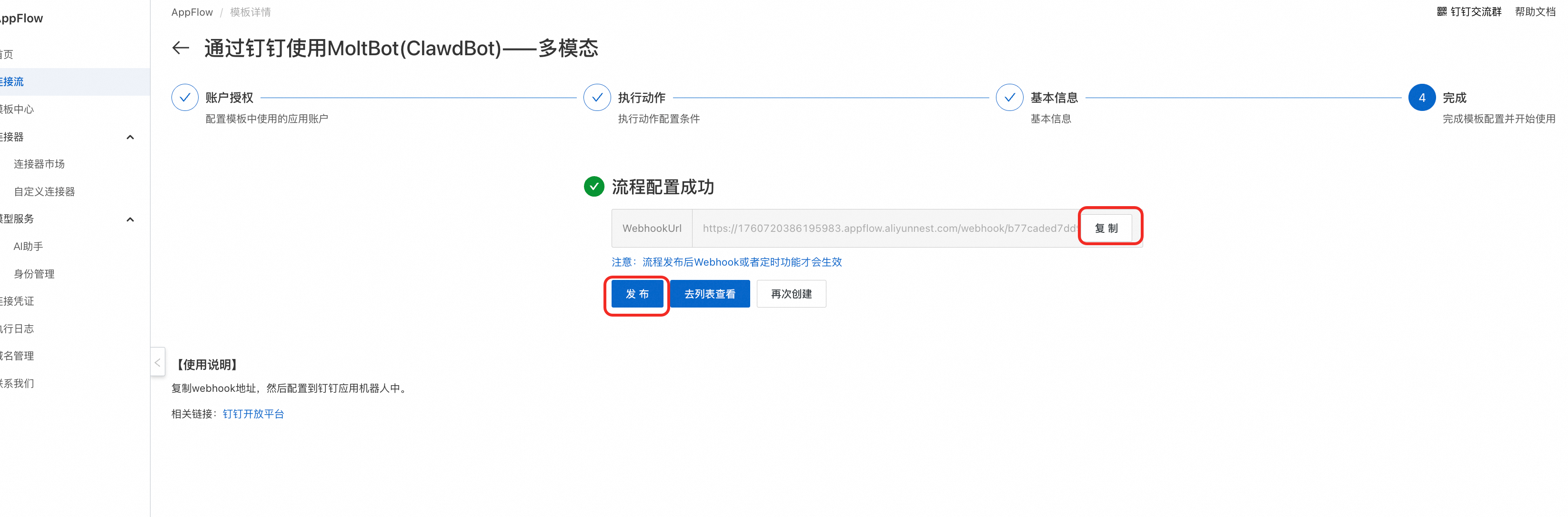 - 界面提示流程配置成功,复制 WebhookUrl,点击发布。