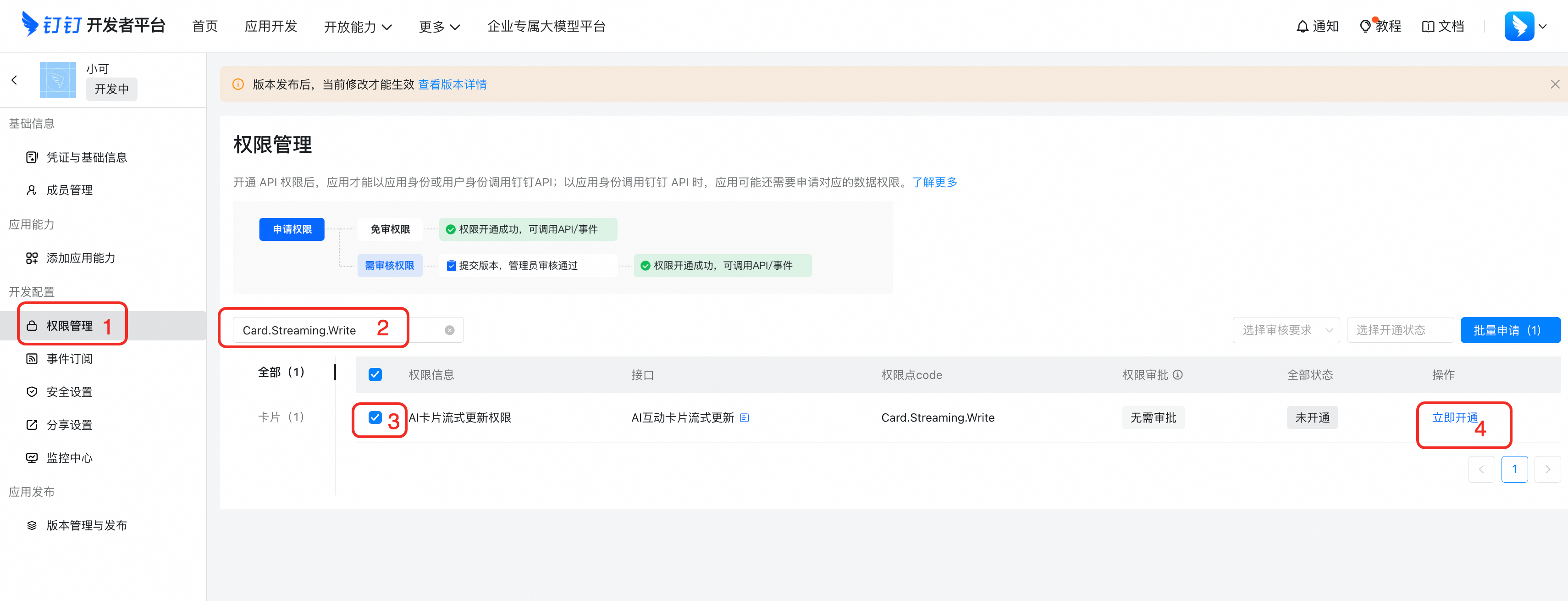 b.在左侧菜单选择开发配置 > 权限管理,在左侧搜索框分别输入Card.Streaming.Write和Card.Instance.Write,并在操作列点击申请权限。