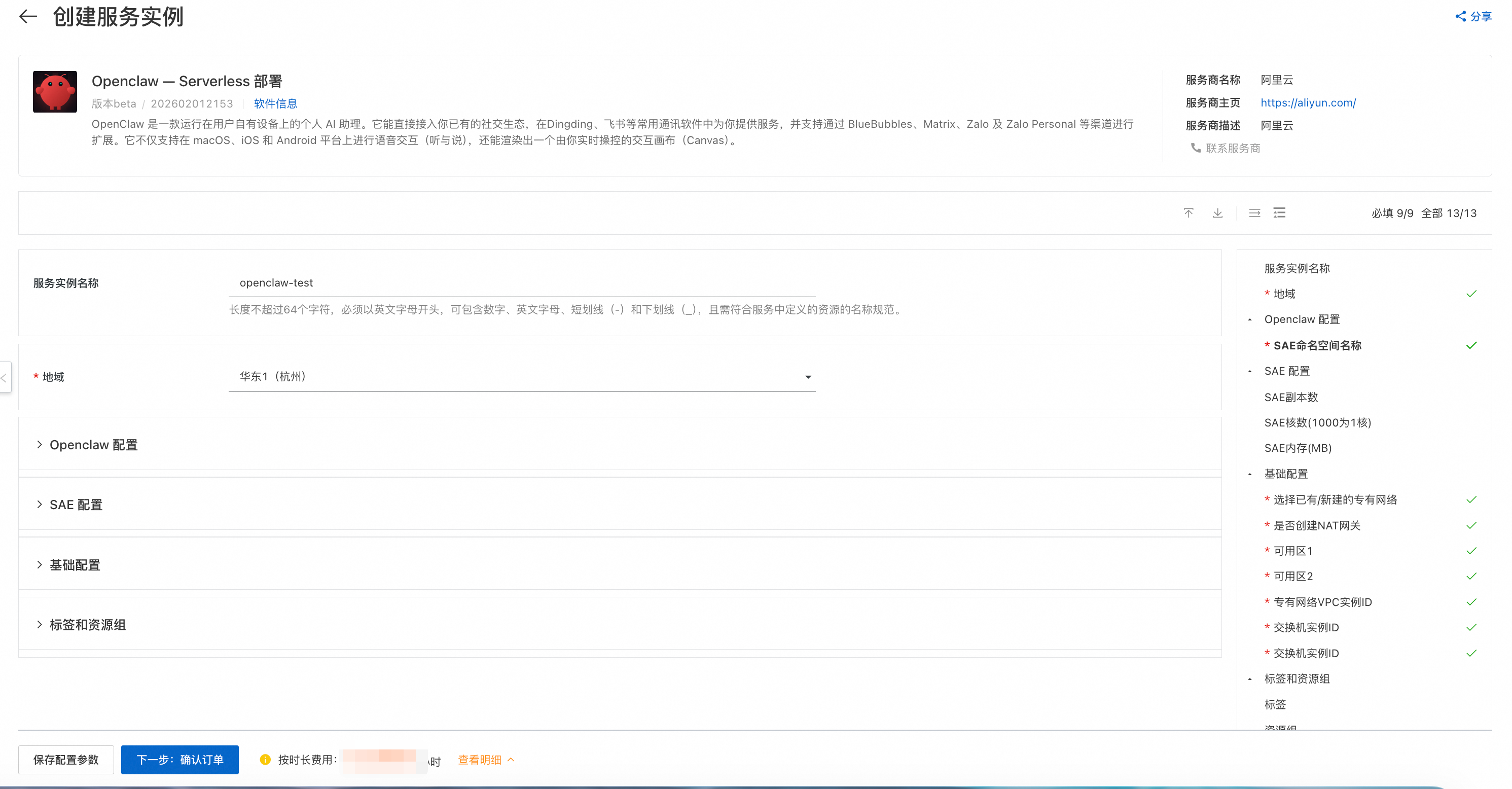 - 搜索并点击模板 「OpenClaw — Serverless 部署」,进入服务创建页面。