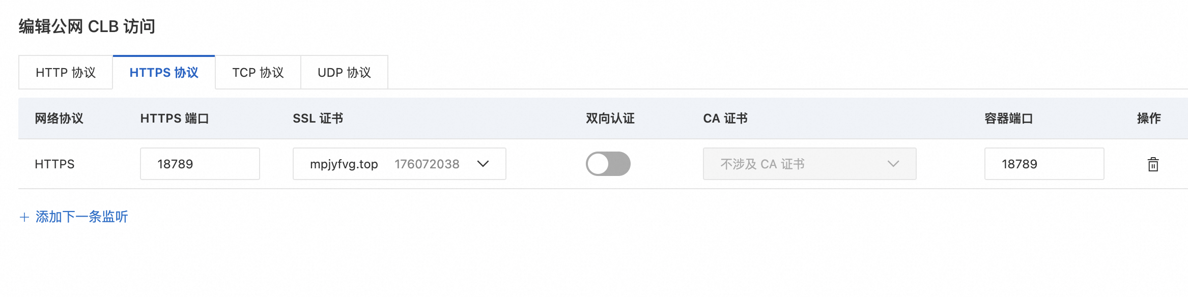 在 SAE 控制台为应用绑定 CLB 并生成公网访问 IP,并配置 HTTPS 监听器,容器端口为 18789(OpenClaw Gateway 监听端口)。