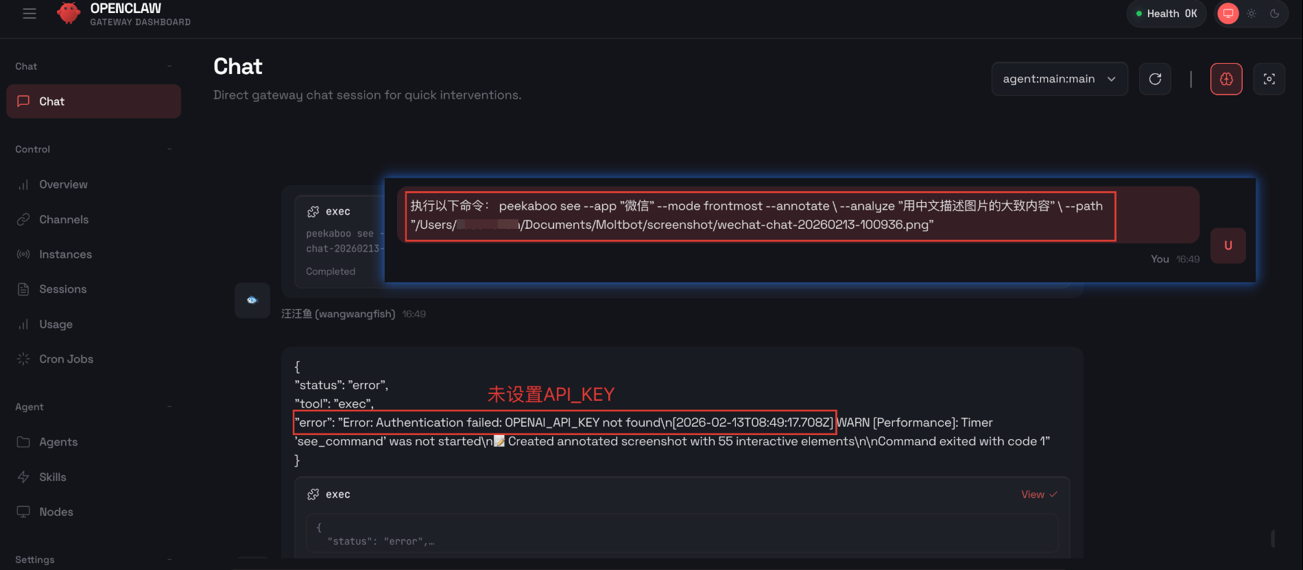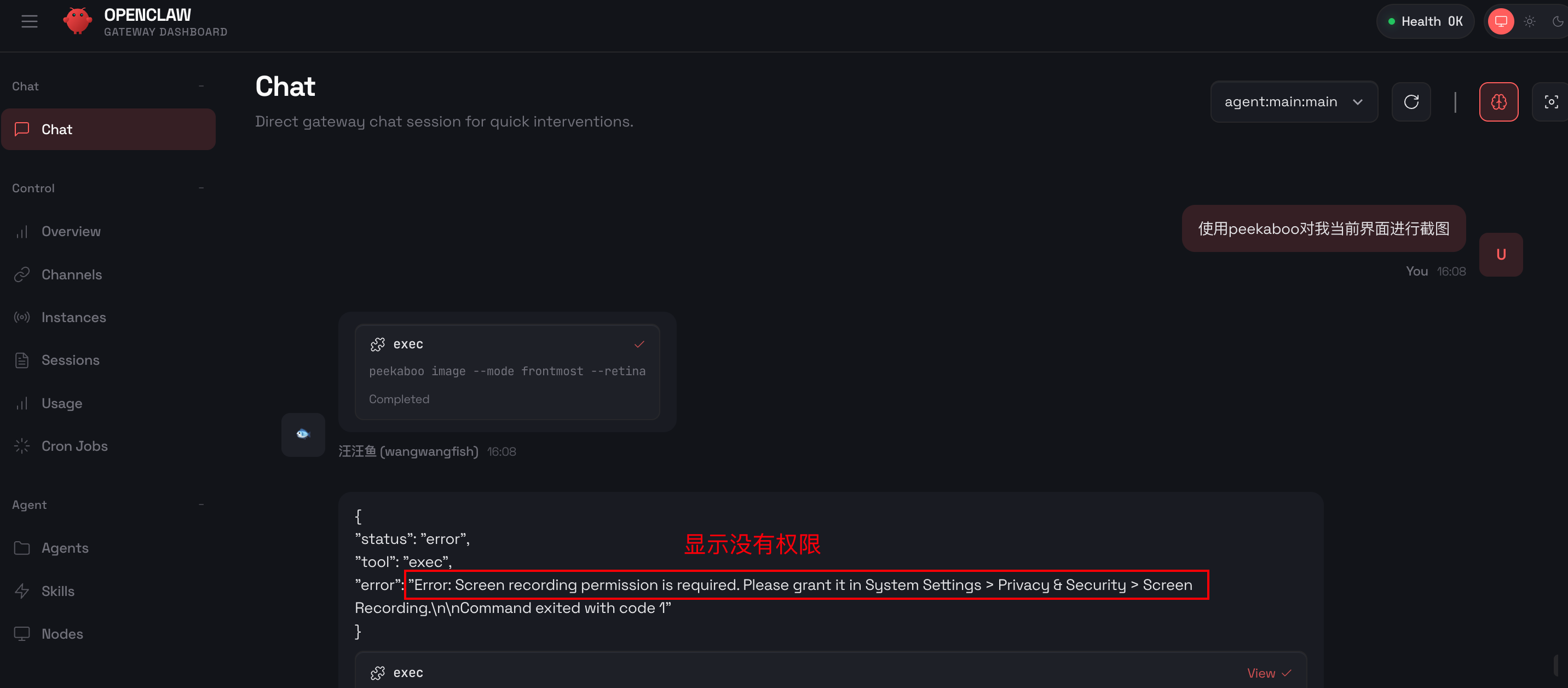 原因:虽然我们给了终端使用peekaboo的权限,但是我们的OpenClaw却没有这个权限,OpenClaw执行命令时打开的shell和我们系统的shell是隔离的。