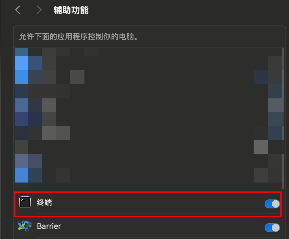 设置-隐私与安全性-辅助功能,点击+,例如可以新增“终端”;