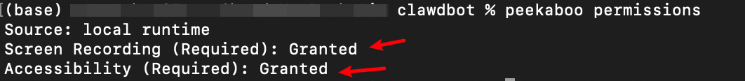 重启终端,再次输入peekaboo permissions,两者都显示Granted即成功: