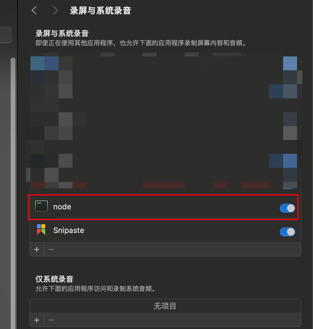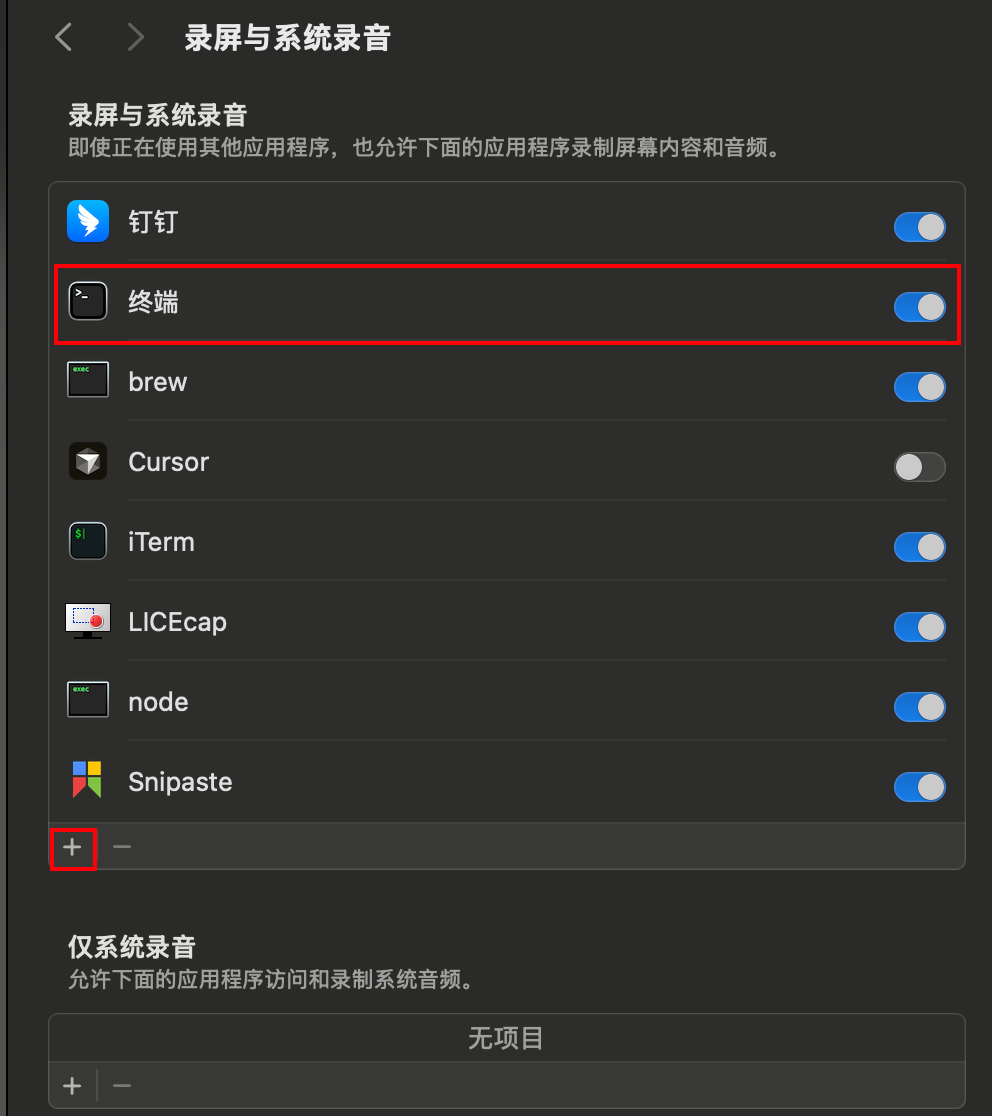 设置-隐私与安全性-录屏与系统录音,点击+,例如可以新增“终端”;