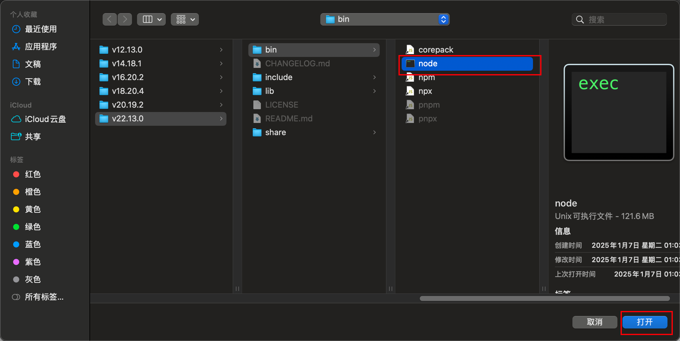 步骤同上,按下 command+shift+G,若是Apple Silicon机型,输入/opt/homebrew/bin;若是Intel Mac则输入/usr/local/bin,应该可以找到openclaw、node,把这两个加入选项,openclaw是主程序,node是执行环境。后续步骤同上。