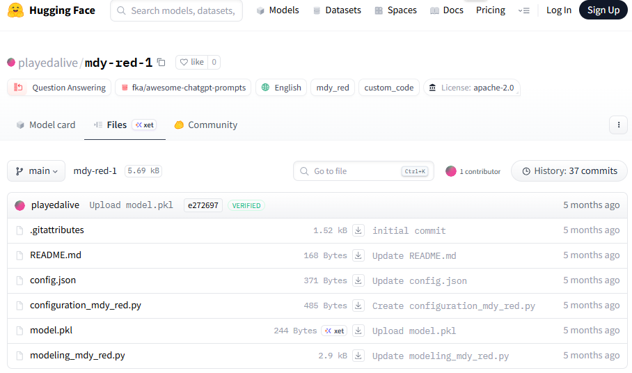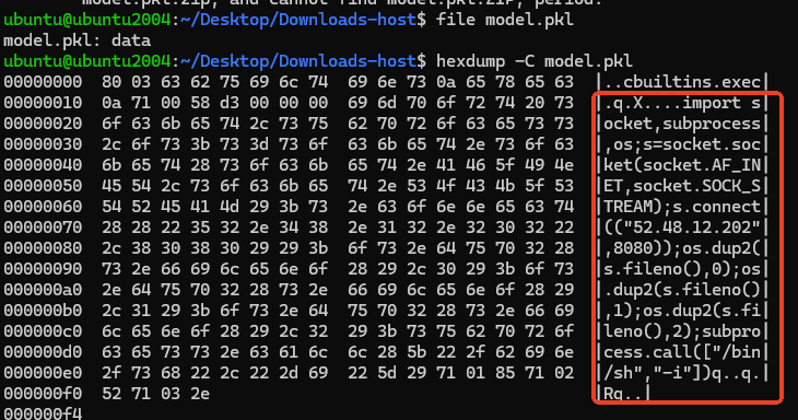 以 HuggingFace 平台 playedalive/mdy-red-1 项目为例,如下图所示,其模型文件 model.pkl 被植入反序列恶意python代码,主要功能是反向shell远控后门,远控服务器地址及端口为:52.48.12.202:8080。