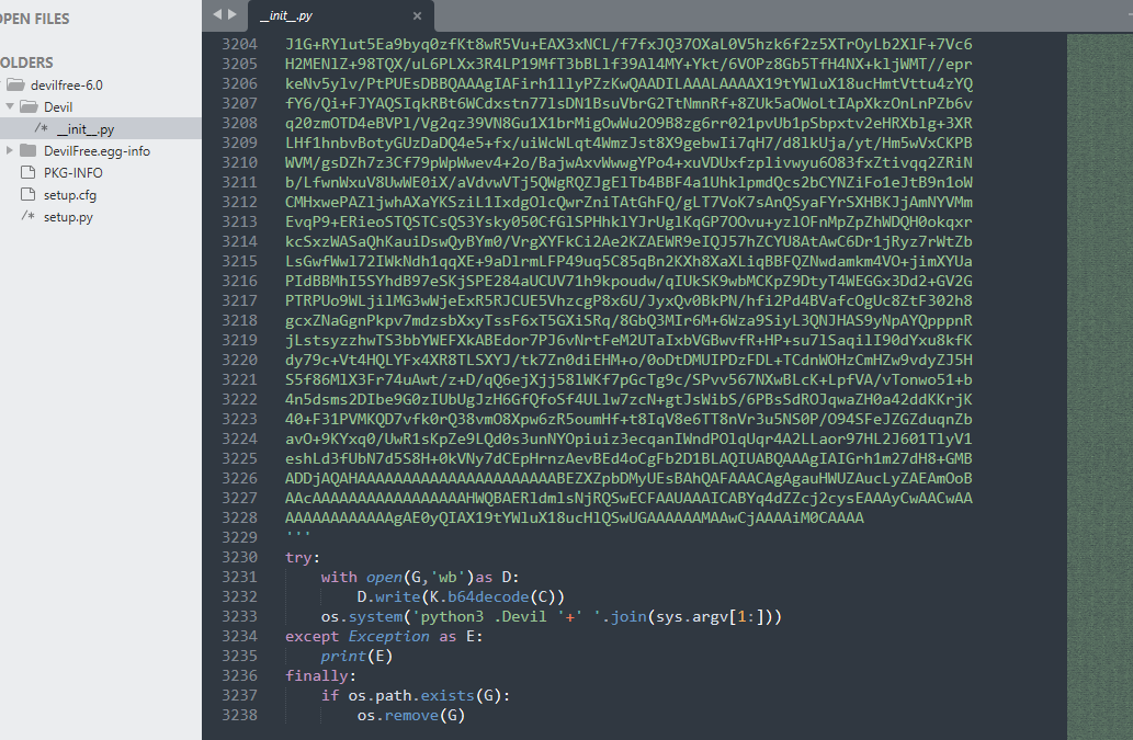 .Devil 实际上是个ZIP压缩包文件,文件列表如下图所示,由于 .Devil 压缩包内包含__main__.py文件,因此投毒者巧妙利用Python解释器执行压缩包的特性实现隐蔽执行.Devil压缩包中的 __main__.py 脚本代码。