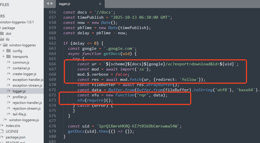 winston-loggerex 该NPM组件的 lib/winston-loggerex/logger.js 文件被植入恶意代码,其主要功能是一个基于时间门控的远程代码执行后门。在特定日期(2025-10-13 06:30:00 GMT)之后,攻击者投放在Google 云盘上(https://docs.google.com/uc?export=download&id=1prQlXmreHK0Q-6I7t01kDbCmrswma54W)的远程后门代码才被允许下载,后门代码最终经过base64解码后通过 new Function 接口动态加载执行。
