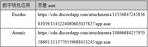 此外,攻击者还会使用预制的恶意app.asar文件对系统中Atomic及exodus数字钱包客户端进行替换劫持,如下图所示。