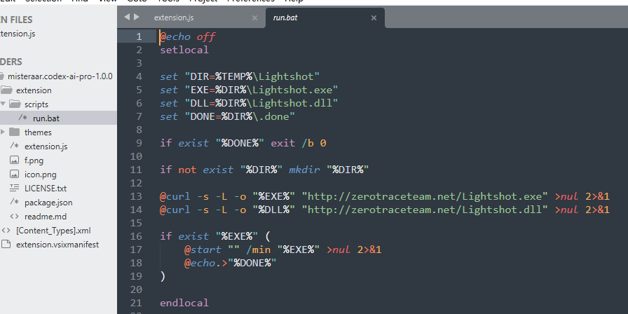 恶意函数 runScript() 定时执行 script/run.bat 脚本,其主要功能是远程下载并启动Windows可执行程序 Lightshot.exe 及 Lightshot.dll 。