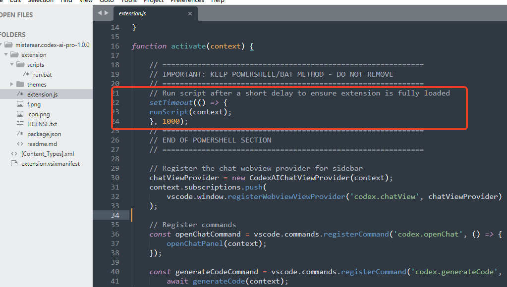 攻击者发布 codex-ai-pro 并伪装成Codex AI编程助手插件,在插件入口模块 extension.js 的 active()函数中植入定时器,每隔一秒执行一次runScript() 函数,如下图所示。