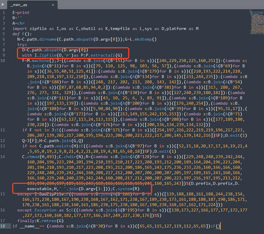 __main__.py 代码内容如下图所示,被混淆处理过,其主要功能是实现对 .Devil 压缩包的自解压,并通过判断当前系统CPU架构来加载执行释放出的恶意可执行程序。不同CPU对应的可执行程序文件映射关系如下所示。