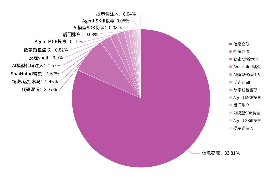 在所有恶意投毒包中,信息窃取攻击仍居高位,占比达83.8%,其中系统平台信息、系统密码文件、网络配置、用户信息、主流浏览器Cookie/登录凭证、数字钱包应用数据以及各类业务凭证口令(包括Github Token、NPM Token、云服务Access Key ID/Secret等)皆为攻击者主要窃取目标。其次,通过远控木马和反连Shell后门进行远控攻击事件也呈逐年上涨趋势。此外,针对Agentic AI开源生态的投毒攻击,除了提示词注入,AI模型文件恶意代码注入、伪装AI模型SDK、stdio模式的Agent MCP Server及Skill包的恶意语义误导及代码投毒都是攻击者常用的AI供应链投毒攻击行为。