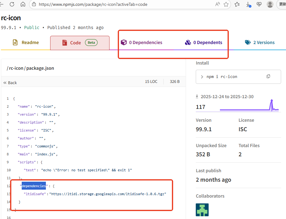 在2025年,悬镜安全情报中心发现数百起NPM投毒攻击事件是通过利用组件外部依赖方式来间接引入恶意包,其主要攻击细节是在NPM组件package.json中通过借用外部高信誉的托管平台来分发恶意依赖包,以此绕过传统静态代码检测以及恶意IoC检测。以rc-icon组件为例,package.json中通过 `dependencies` 配置外部依赖,该外部依赖托管在谷歌云存储上,该方式不仅可规避常规的静态检测,也直接绕过了NPM官方仓库的依赖扫描统计。如下图所示: