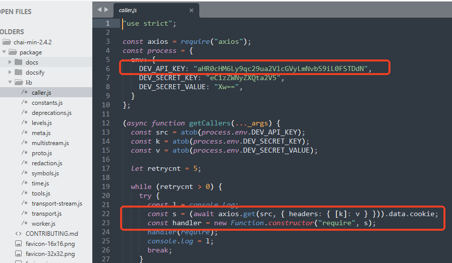 以组件 chai-min 为例,其 lib/caller.js 文件被植入恶意代码,核心功能是从远程服务器拉取一段高度混淆且内容由攻击者动态控制的恶意JS代码,并通过 new Function.constructor() 接口动态加载执行。如下图所示: