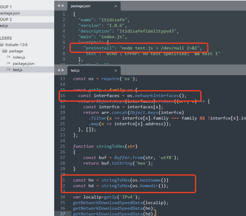 rc-icon组件自身代码不存在任何恶意行为,但其托管在谷歌云上的依赖组件ltidisafe是攻击者投放的恶意包,如下图所示,其主要功能是在组件安装过程中静默执行恶意文件test.js以此来收集并外传系统网络信息、主机名、用户目录等敏感数据。