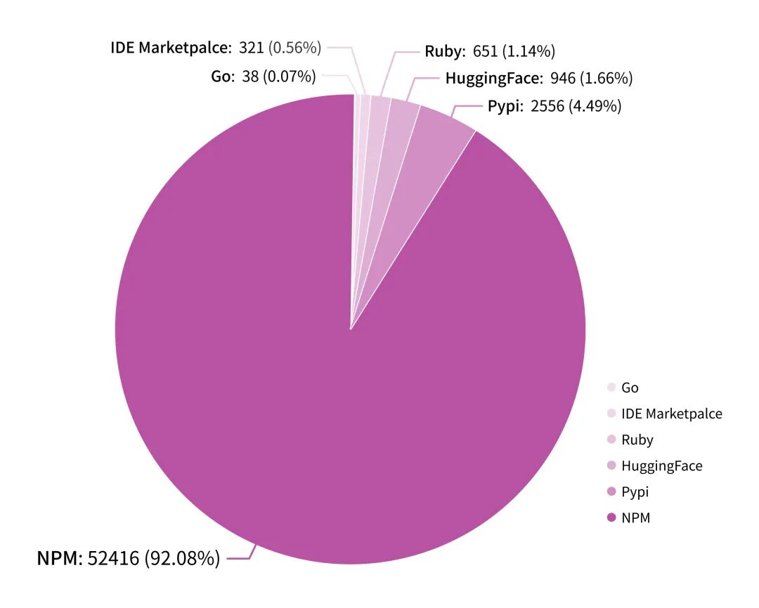 在2025年,悬镜安全情报中心通过持续监控全网主流开源生态平台和Agentic AI生态社区,对潜藏恶意代码风险的投毒包(涉及开源组件、IDE扩展插件、AI模型、Agent MCP及Agent Skill工具等)进行供应链安全智能审查,总共识别56928个存在真实恶意行为及攻击意图的投毒包,总量相较于2024年(约为3.6w)显著提升58%。其中NPM公共仓库的代码投毒占比超过92%。Pypi公共仓库由于在2024年遭受集中式投毒后加强平台安全防护机制(启用账户双因子认证等措施),2025年Pypi仓库投毒占比为4.49%,相较2024年呈现轻微下降趋势。AI模型托管平台HuggingFace已成为恶意模型投放的主要平台,超过940多个模型文件被攻击者实施投毒。此外,针对IDE扩展市场(以VS Code为主)、Ruby及Go生态的投毒攻击也日趋频繁。