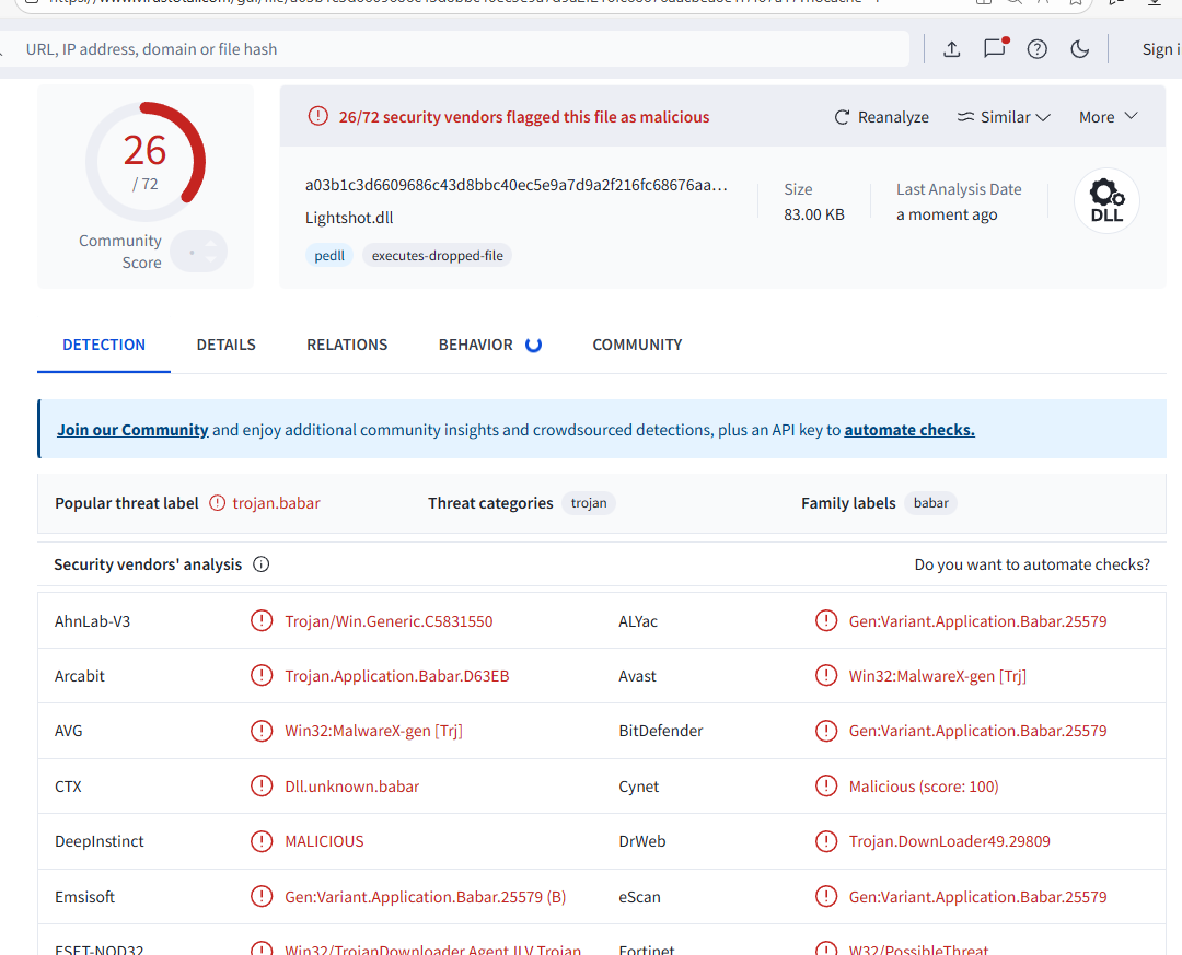 Lightshot.dll 动态链接库实际是一款针对Windows平台的恶意木马,由 Lightshot.exe 负责加载执行。