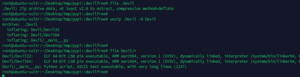 以Python组件 devilfree 为例,该恶意组件运行时会先释放出ZIP压缩包文件 .Devil,接着通过 Python .Devil 命令直接执行ZIP压缩包,如下图所示。