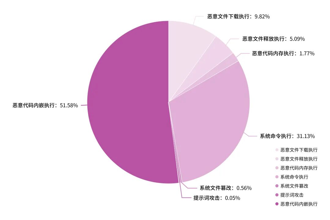 其中,投毒者最常用的攻击方式依旧是恶意代码内嵌执行(51.58%),其攻击流程主要利用主流包管理器中的安装指令在组件包安装或加载时静默执行内嵌在源码文件中的恶意代码。系统命令执行(31.13%)、恶意文件下载执行(9.82%)、恶意文件释放执行(5.09%)、恶意代码内存执行(1.77%)以及系统文件篡改(0.56%)都是攻击者惯用的投毒手段。此外,随着Agentic AI的规模化应用,借助提示词进行恶意语义攻击(提示词注入、语义误导等)也逐渐成为攻击者针对AI开源生态投毒的主要新型攻击方式之一。