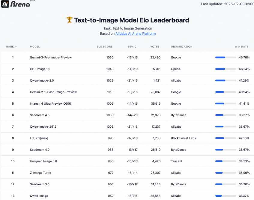 在 AI Arena 的 Elo 排行榜上,Qwen-Image-2.0 的表现堪称亮眼: