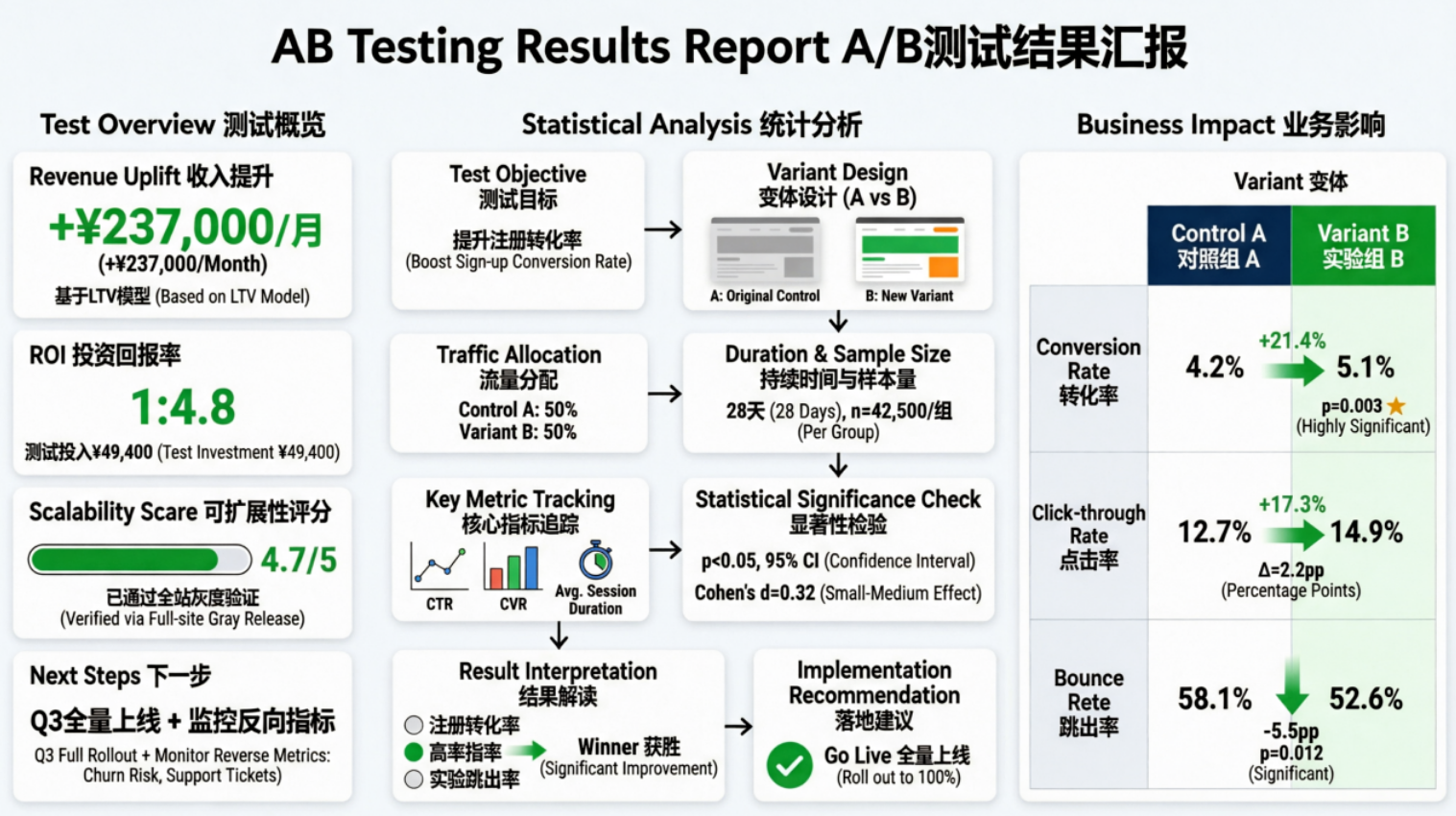 这张 AB 测试结果汇报图,是 Qwen-Image-2.0 在商业领域应用的绝佳范例。它不仅清晰地生成了复杂的信息图表、数据对比和业务指标,更重要的是,其生成的营销素材在实际测试中带来了显著的业务提升: