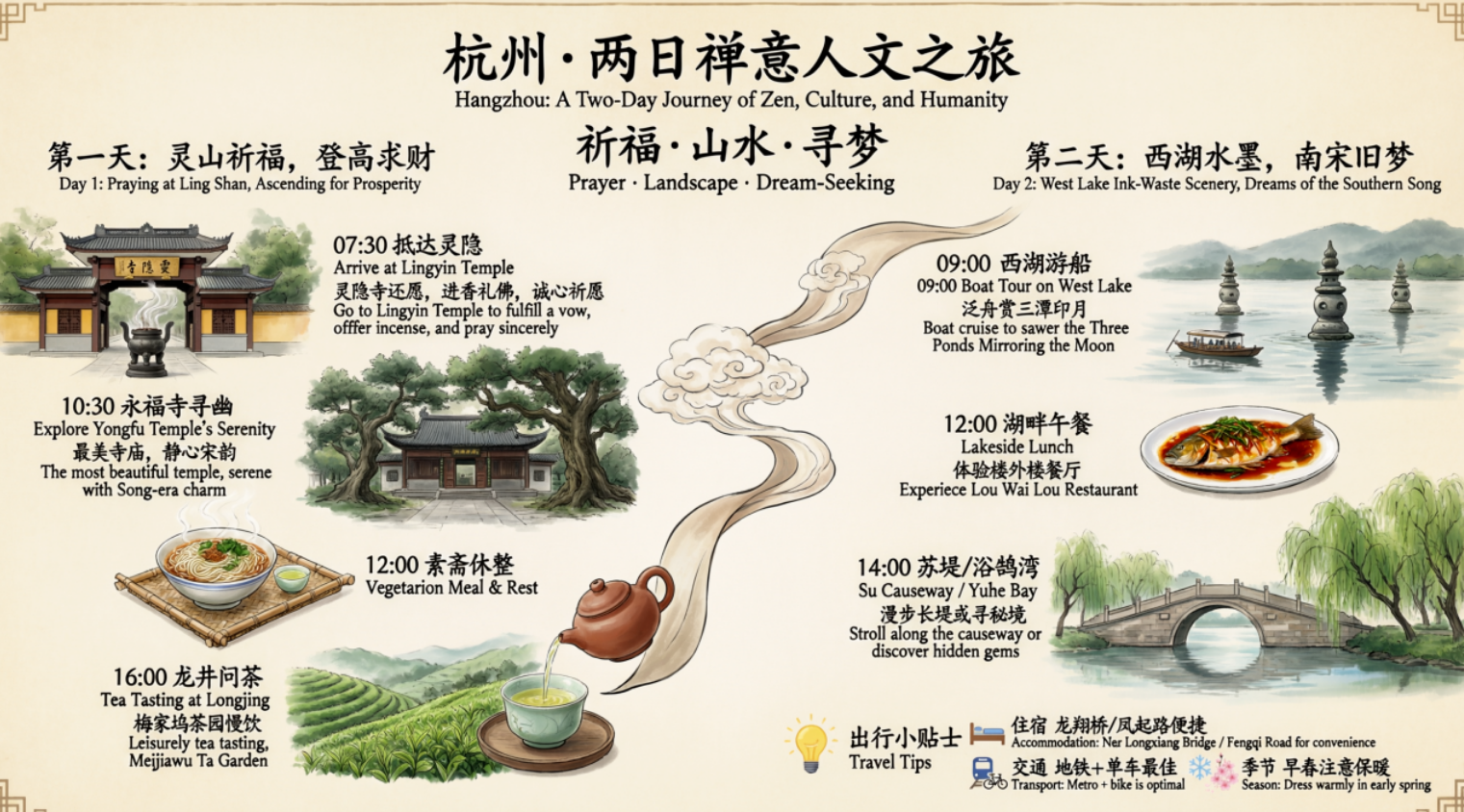 - 旅游海报:“杭州・两日禅意人文之旅” 的海报,将灵隐寺、西湖、龙井问茶等多个景点巧妙地融合在一张图中,风格统一,信息清晰,极具设计感。