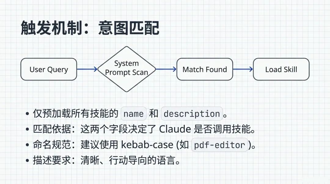 预加载极简:系统仅预加载所有技能的 name 和 description,别的一概不看 。
