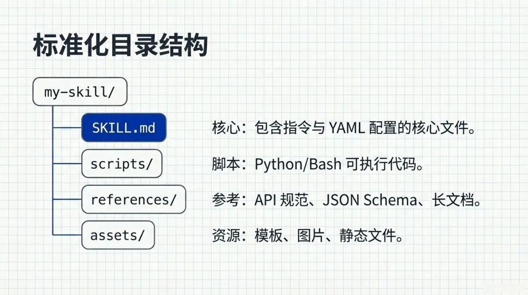 my-skill SKILL.md:这是大脑。包含指令与 YAML 配置的核心文件 。scripts/:这是手脚。存放 Python 或 Bash 可执行代码 。references/:这是参考书。存放 API 规范、JSON Schema、长文档assets/:这是素材库。模板、图片、静态文件放这 。