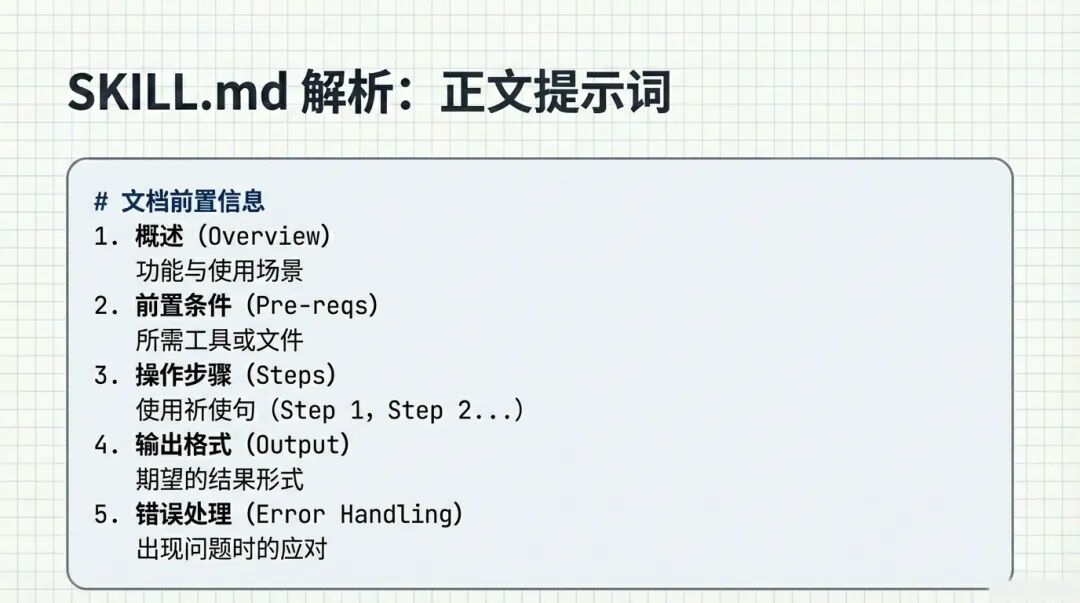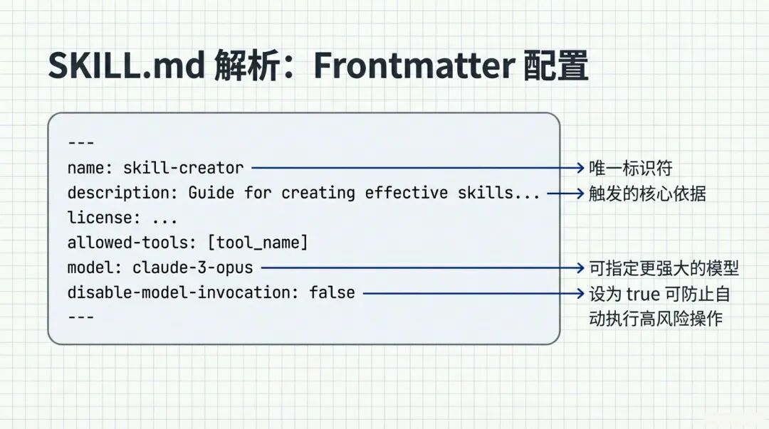 SKILL.md是整个技能的灵魂。它通常由两部分组成:Frontmatter(前置配置)和正文提示词。