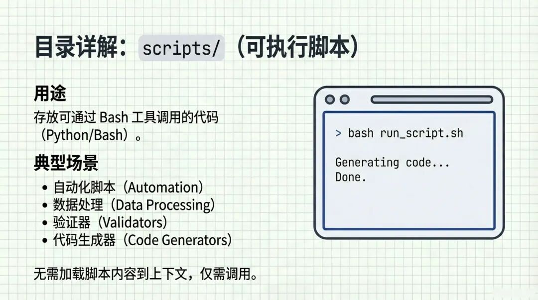 咱们前面说了,Agent Skills 的核心优势是执行力。那执行力靠什么落地?就靠scripts/文件夹 。