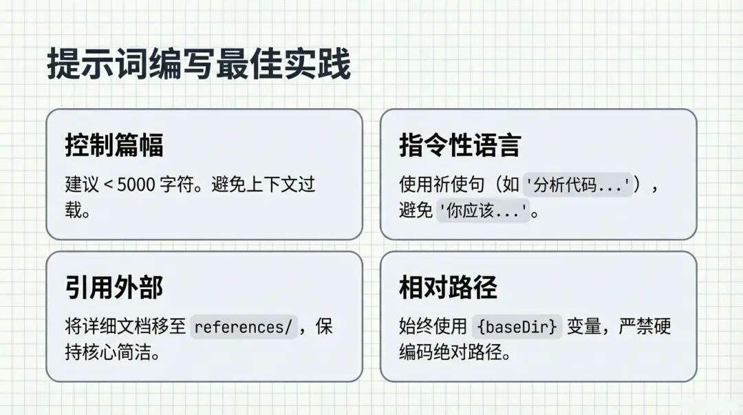 控制篇幅:建议整个SKILL.md不要超过 5000 字符 。别把所有废话都写在里面,避免上下文过载。
