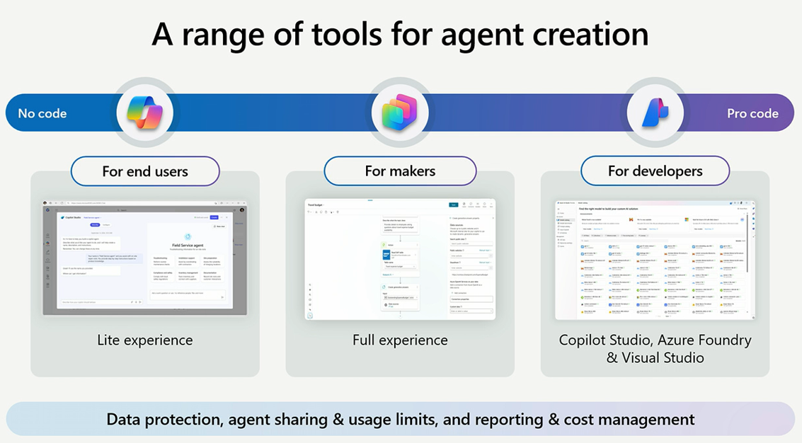 AI(尤其是Agent和Copilot)是微软的Ignite 2025大会(2025/11/18-2025/11/22)最重要的主题。当前制作Agent从No code到Pro code有如下一些方式,