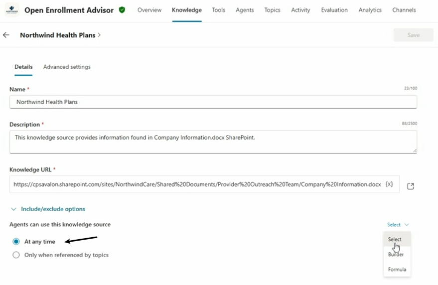 2) 在Advanced settings tab中,可以进行knowledge source的条件配置,如下图所示,