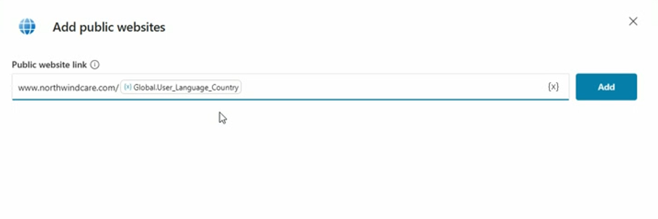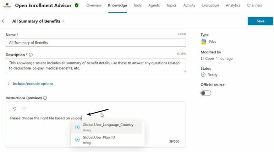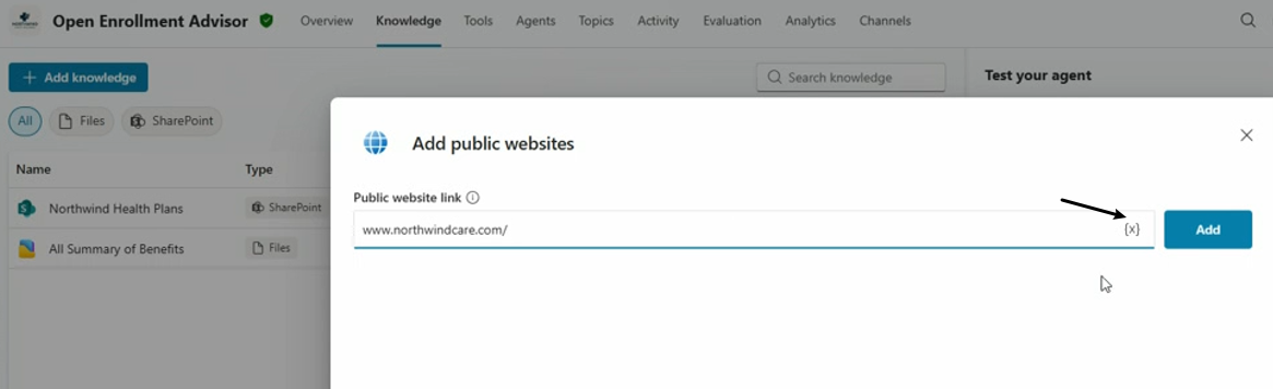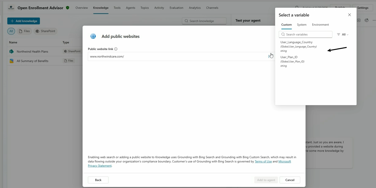在配置agent的knowledge source和instructions时,都可以使用variable进行配置,下面的例子是添加一个public website作为knowledge source,