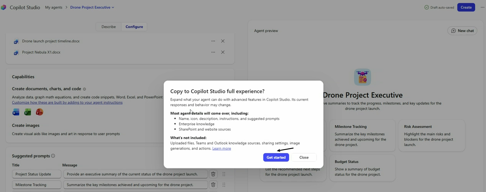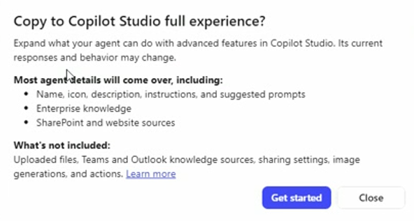 2) 在弹出的Copy to Copilot Studio full experience 窗口中,点击Get Started按钮即可,