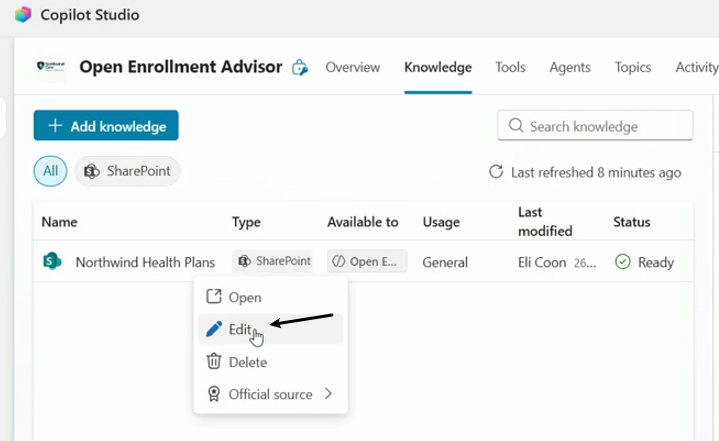1) 打开Copilot Studio中特定agent的Knowledge配置界面,选中某个knowledge, 点击Edit,
